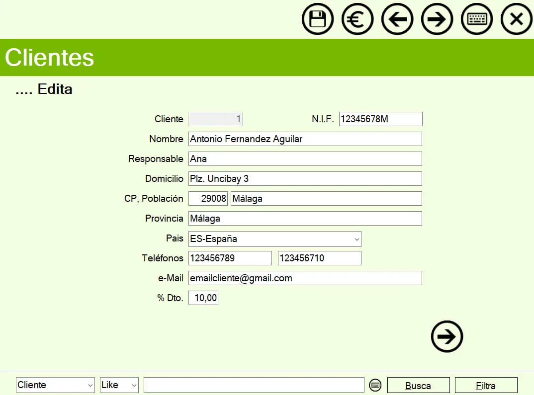 Ficha de clientes donde se puede indicar varios datos, por ejemplo la fecha de nacimiento o notas donde podemos escribir algún comentario sobre el clientes. Créditos a clientes, listado de clientes.