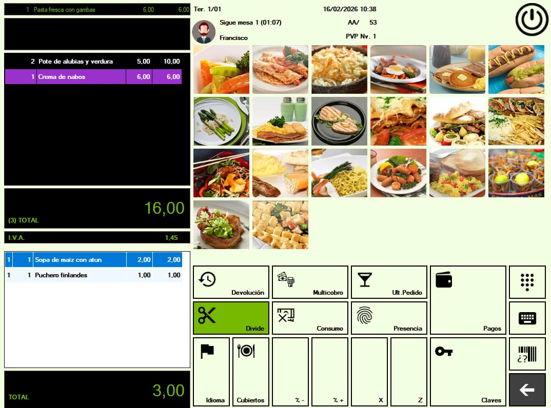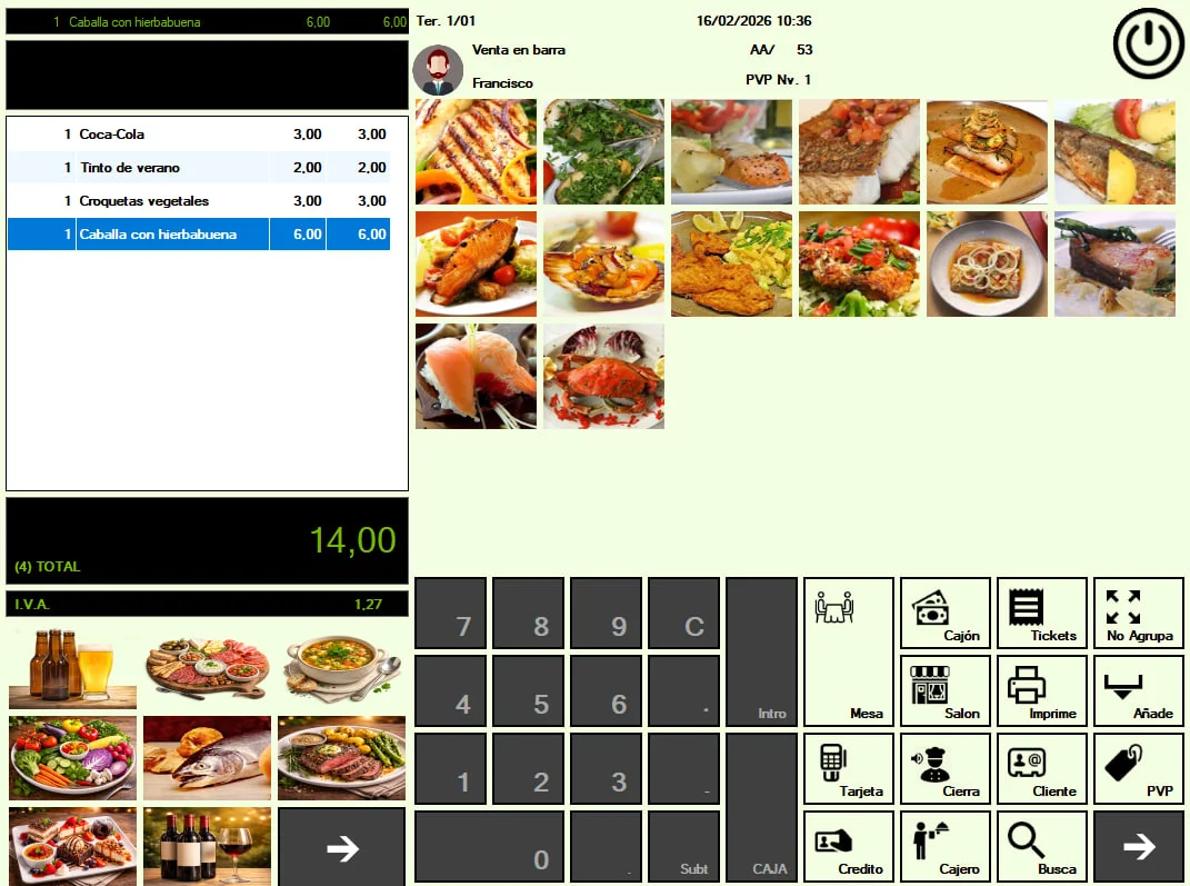 La pantalla de ventas tiene un fácil acceso a los grupos de la carta y a su vez a los platos pudiendo identificarse mediante fotos o por colores y nombre del producto. Posibilidad de ordenar los productos o grupos de la carta. Acceso rápido a las teclas de funciones más habituales.