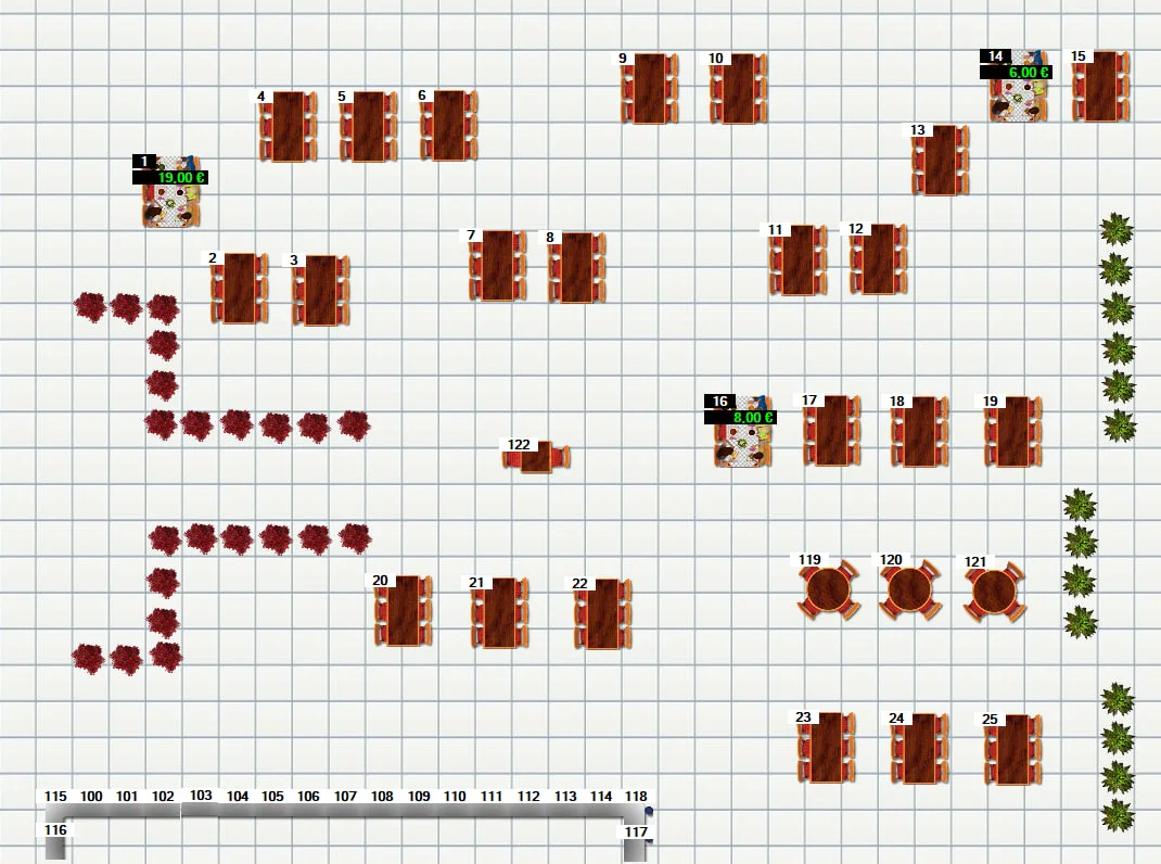 Diseñe tantos salones como zonas tenga en su negocio, zona de barra y tapas, salón comedor, terraza, etc. Mediante el diseño del salón ud. puede comprobar el estado de sus mesas en una sola pantalla, conozca la ocupación y los comensales por mesa, las mesas libres, los clientes que han realizado el pedido y quien ha solicitado la cuenta y están a la espera de efectuar el pago.